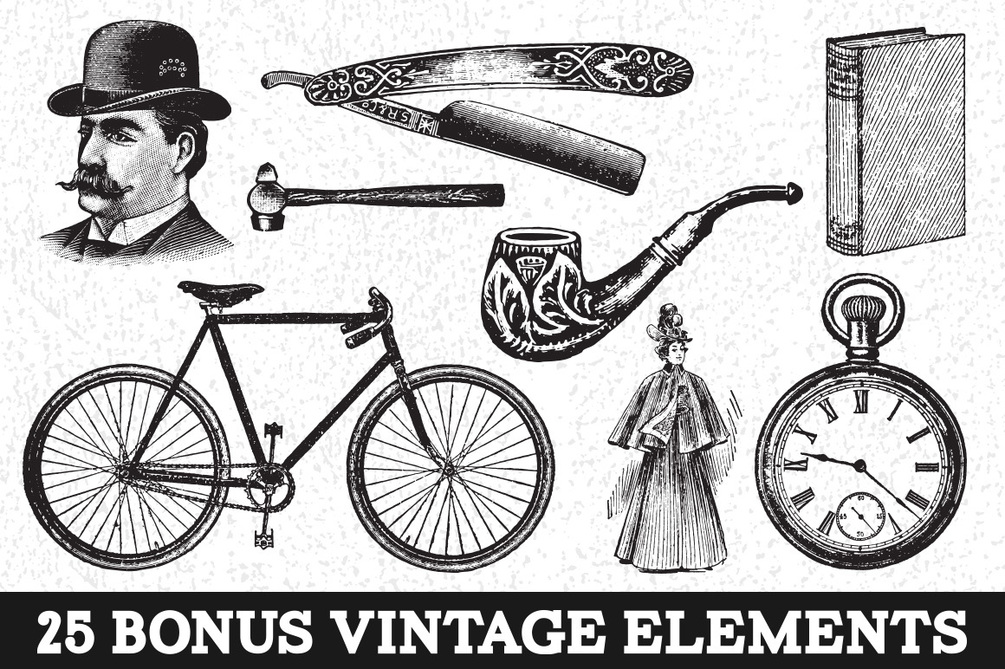 As an added bonus, I have included 25 authentic vintage clip art pieces for you to use on your work as you see fit. They are provided in both Illustrator as well as Photoshop format to give you the versatility to use them how you see fit. This kit can transform your designs and illustrations in literally seconds, so if you enjoy saving a lot of time and creating amazing end results, this pack might be right up your alley!